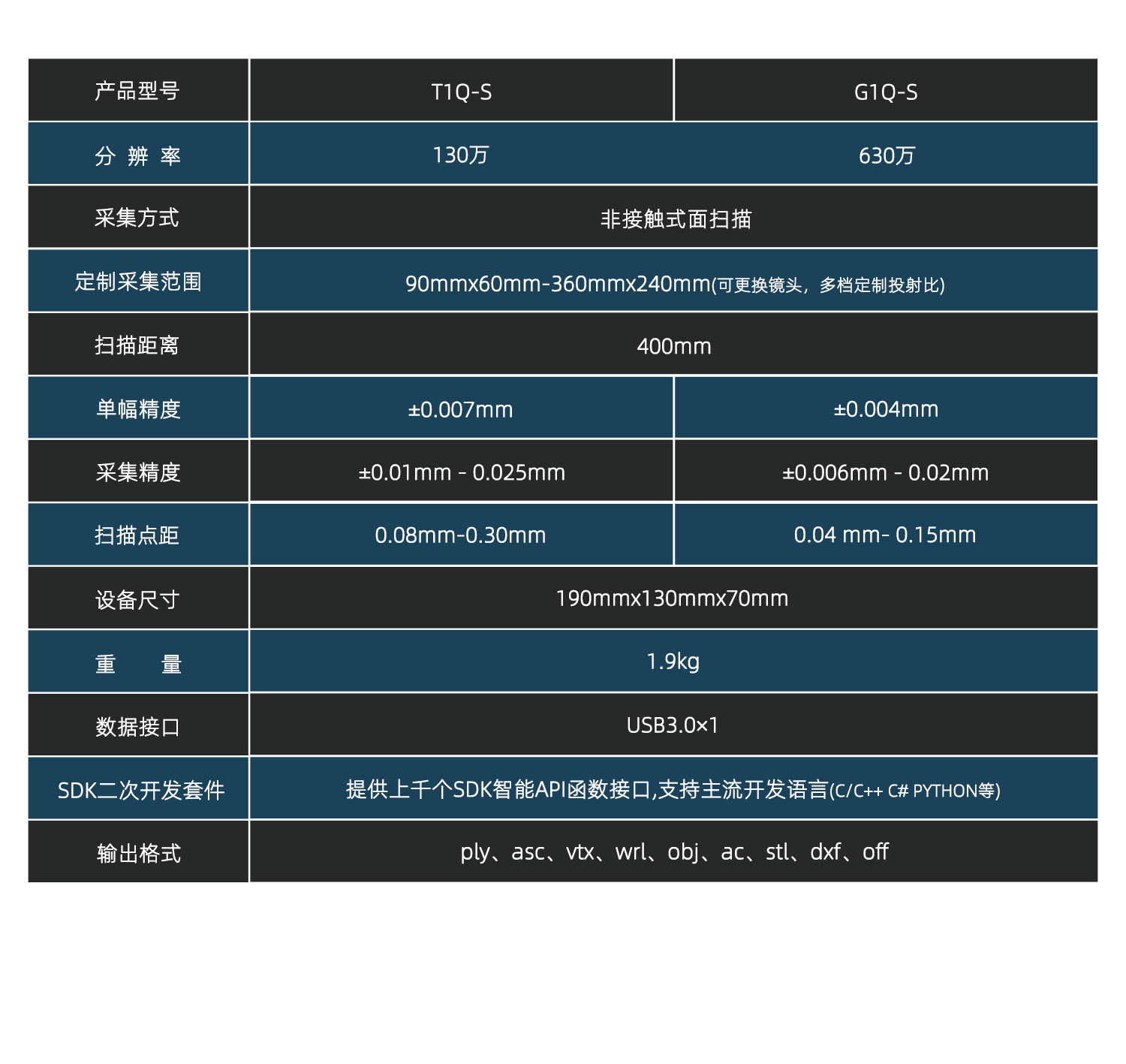 來高科技的“Smart-1系列”為工業級高精度3D智能相機,T1Q-S型號屬于3D智能相機Smart-1系列之一。T1Q-S采用多類鏡頭的兼容式設計,在原有產品基礎上,優化硬件設計,提升產品IP等級,結構小巧,減輕重量,現場部署更加靈活。采用131w像素的工業相機,支持0.6秒高速采集,精度可達0.01mm,具有多種點云數據拼接方式,能有效的提高自動化應用中的工作效率及精度。