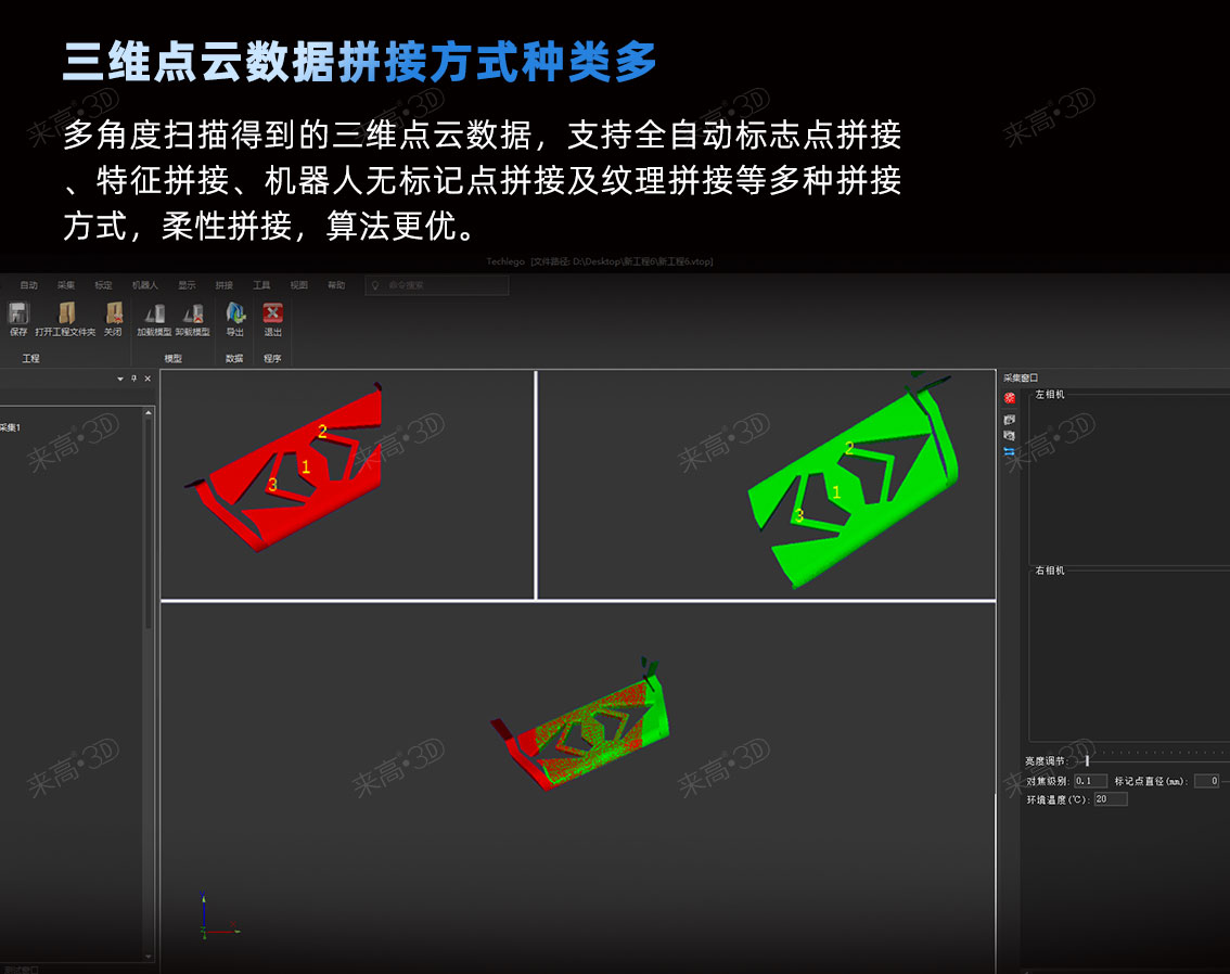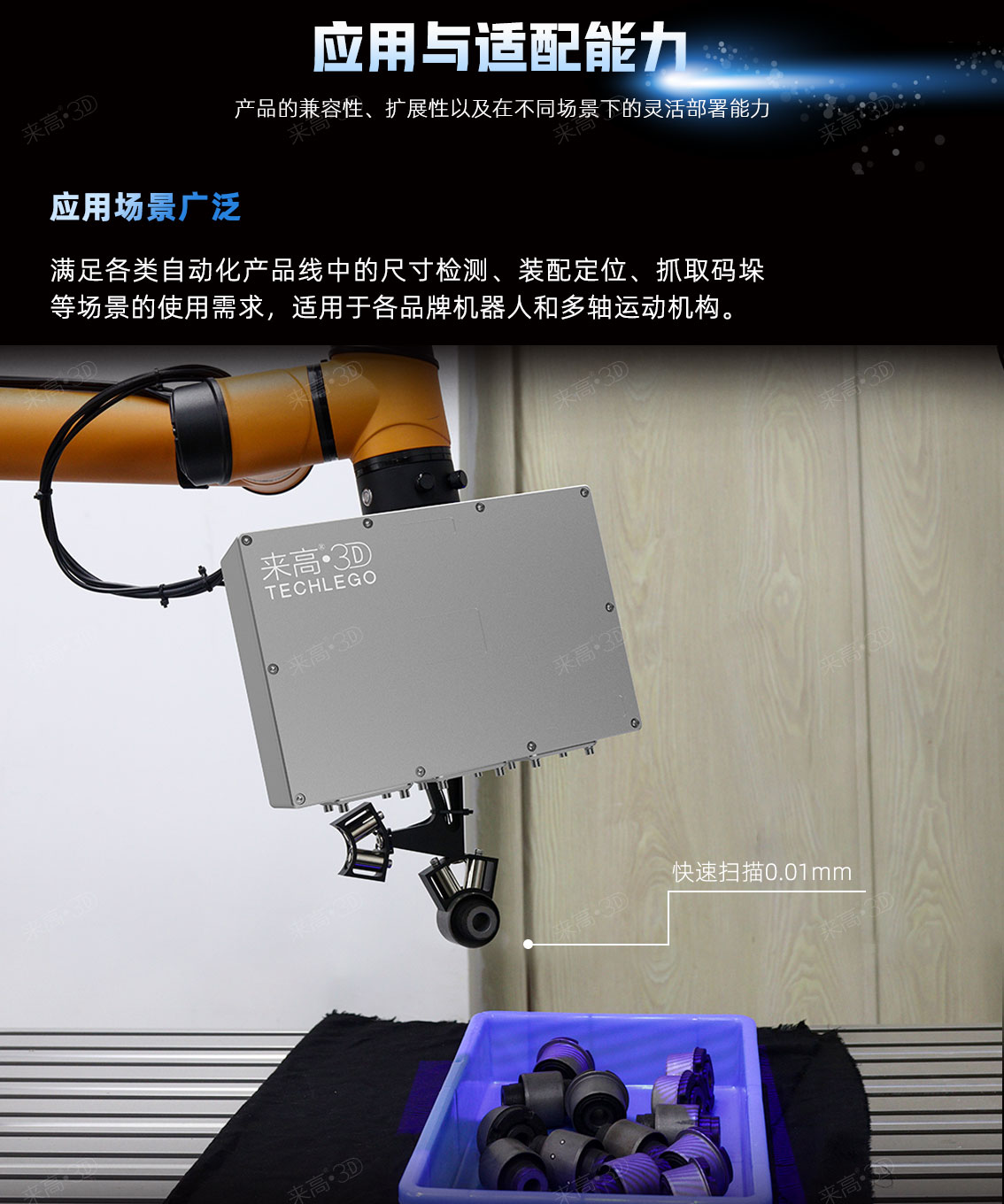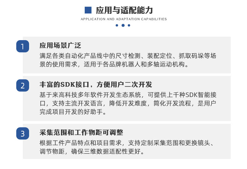 除此之外,T1Q-Ex增加了上千種SDK接口,方便用戶二次開發(fā),可以自由控制3D智能相機(jī)的自動標(biāo)定、自動化采集、自動化拼接、工程修正、手眼標(biāo)定以及轉(zhuǎn)軸標(biāo)定等功能,由被動控制轉(zhuǎn)向主動控制,應(yīng)用于各類自動化產(chǎn)品線中的尺寸檢測、裝配定位、抓取碼垛等場景。