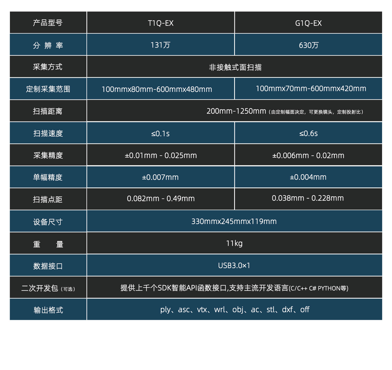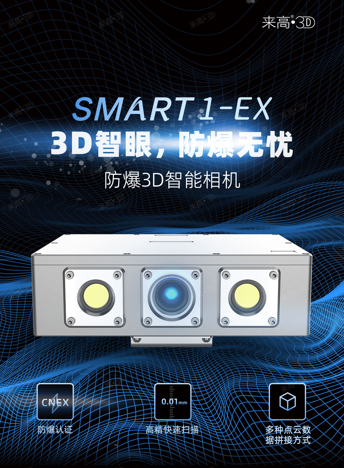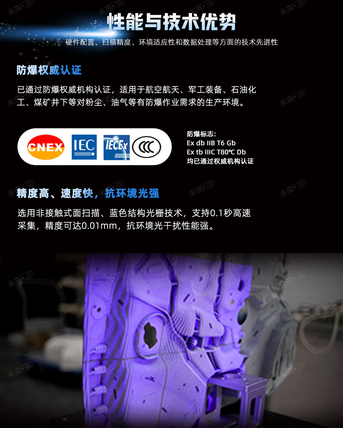 來高科技的“Smart-1系列”為工業(yè)級高精度3D智能相機(jī),T1Q-Ex型號屬于3D智能相機(jī)Smart-1系列之一。T1Q-Ex采用多類鏡頭的兼容式設(shè)計,在原有產(chǎn)品基礎(chǔ)上,優(yōu)化硬件設(shè)計,提升產(chǎn)品防爆等級,防爆標(biāo)志為Ex db IIB T6 Gb,Ex tb IIIC T80℃ Db,已通過防爆權(quán)威機(jī)構(gòu)認(rèn)證,適用于航空航天、軍工裝備、石油化工、煤礦井下等對粉塵、油氣等有防爆作業(yè)需求的生產(chǎn)環(huán)境。采用131w像素的工業(yè)相機(jī),支持0.1秒高速采集,精度可達(dá)0.01mm,具有多種點(diǎn)云數(shù)據(jù)拼接方式,能有效的提高自動化應(yīng)用中的工作效率及精度。