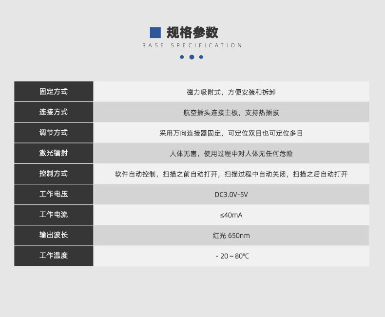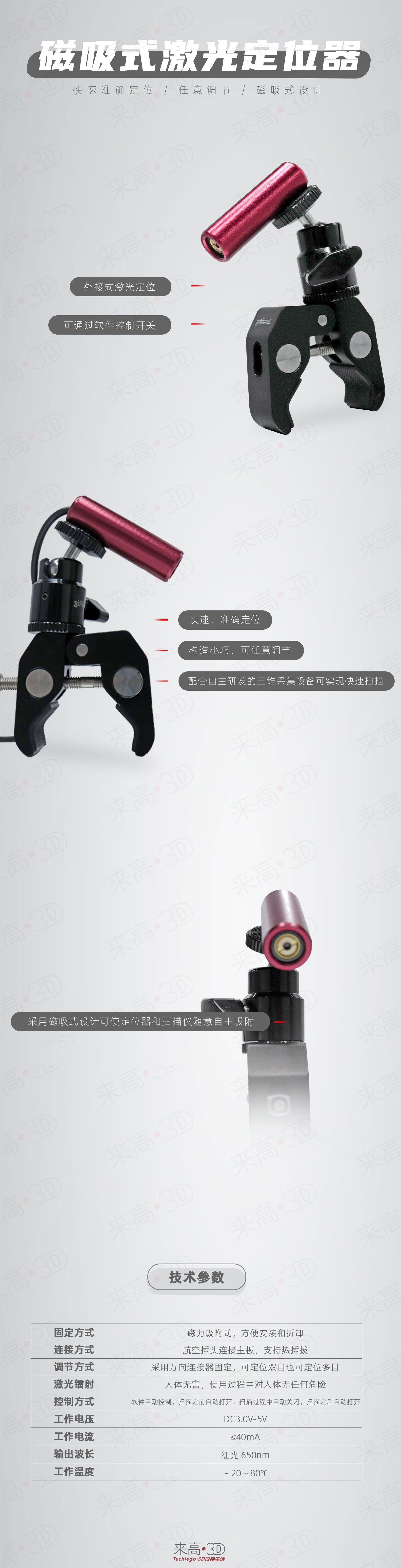 1.掃描時智能關閉激光定位器,不會造成掃描誤差 2.磁吸式吸附方式使固定更加方便 3.任意調節功能使定位更加靈活 4.采用航空接口連接使通信更加穩定
