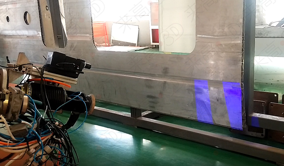 來高科技通過ABB機器人結合工業級三維掃描儀自動化三維掃描,將掃描的模型數據傳輸給機器人,實現柔性打磨,解決打磨效率低、精度差的難題,實現膩子厚度全自動打磨。并在高鐵車身、地鐵車身等需要大面積打磨的項目中,展開廣泛的應用。
