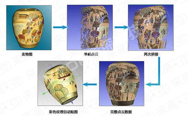 如何逼真的還原文物的色彩是三維掃描儀的難點(diǎn),來(lái)高科技根據(jù)獨(dú)特的白平衡調(diào)節(jié)方法和高性能的彩色相機(jī),高度還原文物的色彩。