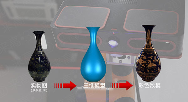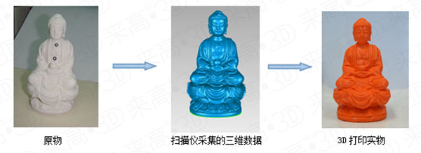 通過(guò)對(duì)工藝品進(jìn)行掃描獲得三維數(shù)據(jù),把三維數(shù)據(jù)導(dǎo)入到3D打印機(jī)中進(jìn)行打印,便可以快速?gòu)?fù)制