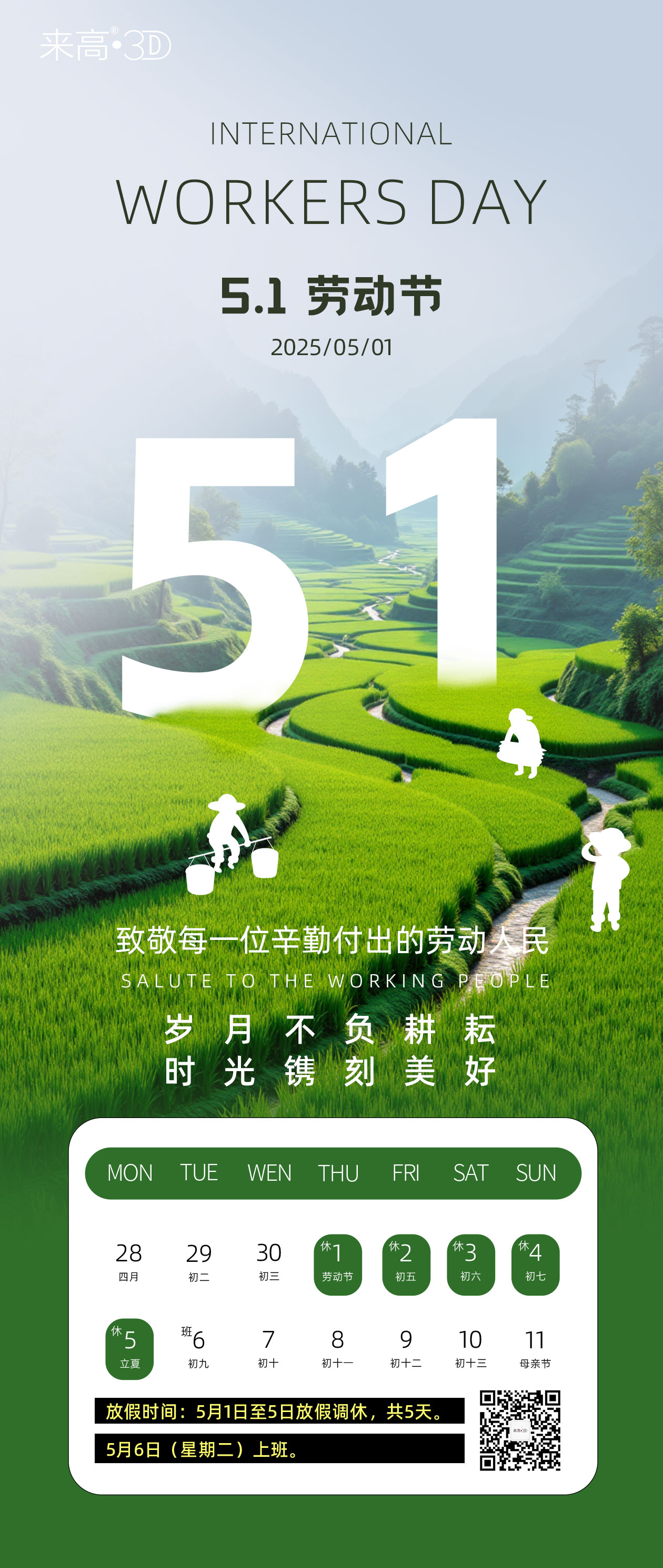 值此五一勞動節來臨之際,‌來高科技公司‌全體員工衷心感謝您長期以來的支持與信任!根據國家法定節假日安排,結合我司實際情況,現將放假時間及服務安排告知如下: