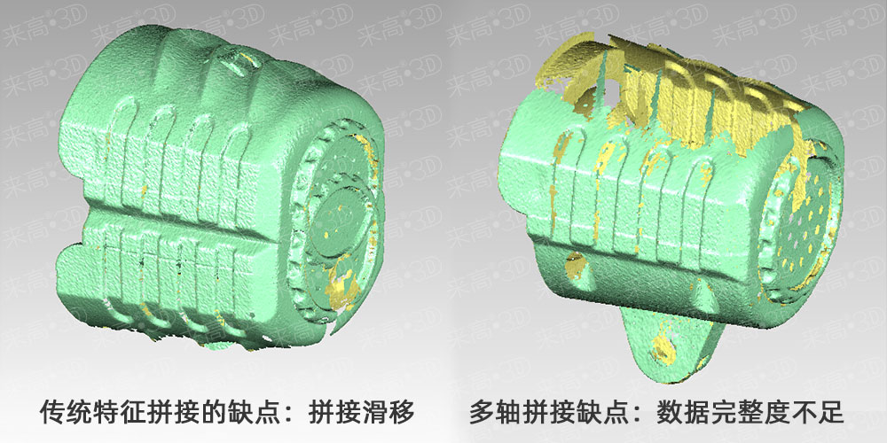 一般三維掃描儀基本都具備特征拼接功能,有了這個(gè)功能后,三維掃描儀在掃描過(guò)程中可以省去粘貼標(biāo)志點(diǎn)的步驟。但是目前在三維掃描操作中,多數(shù)使用者依然選擇采用標(biāo)志點(diǎn)拼接,其主要原因是特征拼接功能存在著許多的弊端,比如數(shù)據(jù)錯(cuò)層整體精度差相鄰數(shù)據(jù)相交范圍大容易拼接失敗等等,而在實(shí)際工作中,這些問(wèn)題遠(yuǎn)比粘貼標(biāo)志點(diǎn)的代價(jià)更大。針對(duì)以上問(wèn)題,來(lái)高科技研發(fā)團(tuán)隊(duì)通過(guò)不懈努力,不斷地實(shí)驗(yàn)及改進(jìn),最終研發(fā)出了混合式特征拼接算法