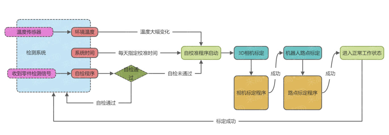 視覺精度平衡系統就是用來解決這些外界因素對機器視覺設備精度影響的一套系統,這套系統包含:相關的傳感器(例如溫度傳感器)、修正算法以及程序的兼容邏輯。視覺精度平衡系統屬于定制開發系統,來高科技研發團隊會根據客戶需求和工作場景的實施條件,進行一對一的開發。(下圖僅供參考)