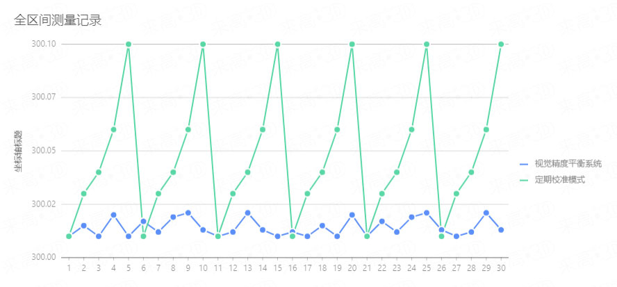 該折線圖記錄的是30天的基準物測量值,用來對比定期校準模式(每5天進行一次機器視覺設備校準),通過這個折線圖可以看出,視覺精度平衡系統的作用非常大。