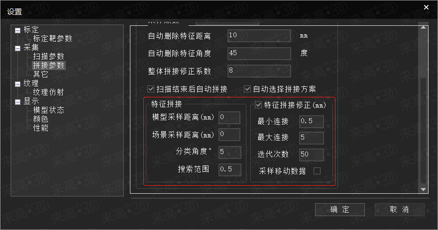 三維視覺系統(tǒng)在引導(dǎo)機(jī)器人定位時(shí),首先要在模板數(shù)據(jù)和當(dāng)前三維點(diǎn)云數(shù)據(jù)之間進(jìn)行特征匹配。為了適應(yīng)不同特征的工件和應(yīng)用場(chǎng)景,高三維掃描軟件(Techlego)提供匹配算法,并且對(duì)外開放匹配參數(shù)的設(shè)置。匹配參數(shù)主要包含拼接參數(shù)中的特征拼接參數(shù)和特征拼接修正參數(shù)兩部分內(nèi)容,如下圖所示。