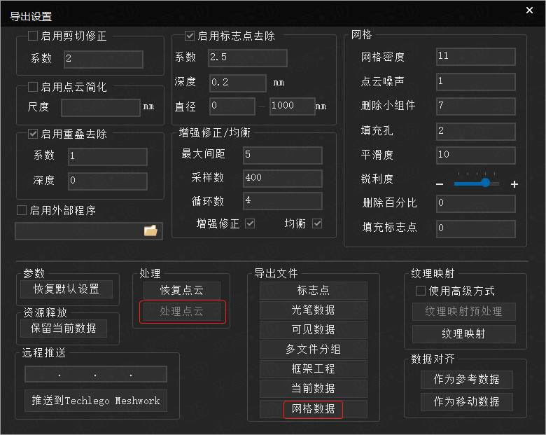 ②用戶S確認后,在導出界面中需要設置參數,然后再點擊“處理點云”(這兩步操作也是必要的),雖然參數設定之后便可以記憶,但用戶可能對于不同工件的模型導出要求也不同,此處可以隨時進行修改。