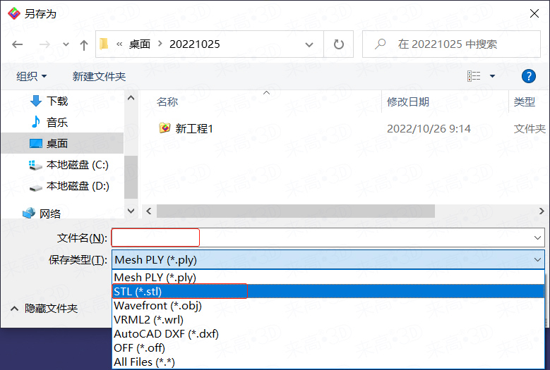 ③最后點擊“網格數據”會打開“另存為”窗口,用戶S在這里需要選擇文件類型, 在本案例中文件類型為STL文件(當然STL并不是第一個默認類型),然后指定輸出路徑并輸入文件名稱,點擊“確認”輸出STL文件。
