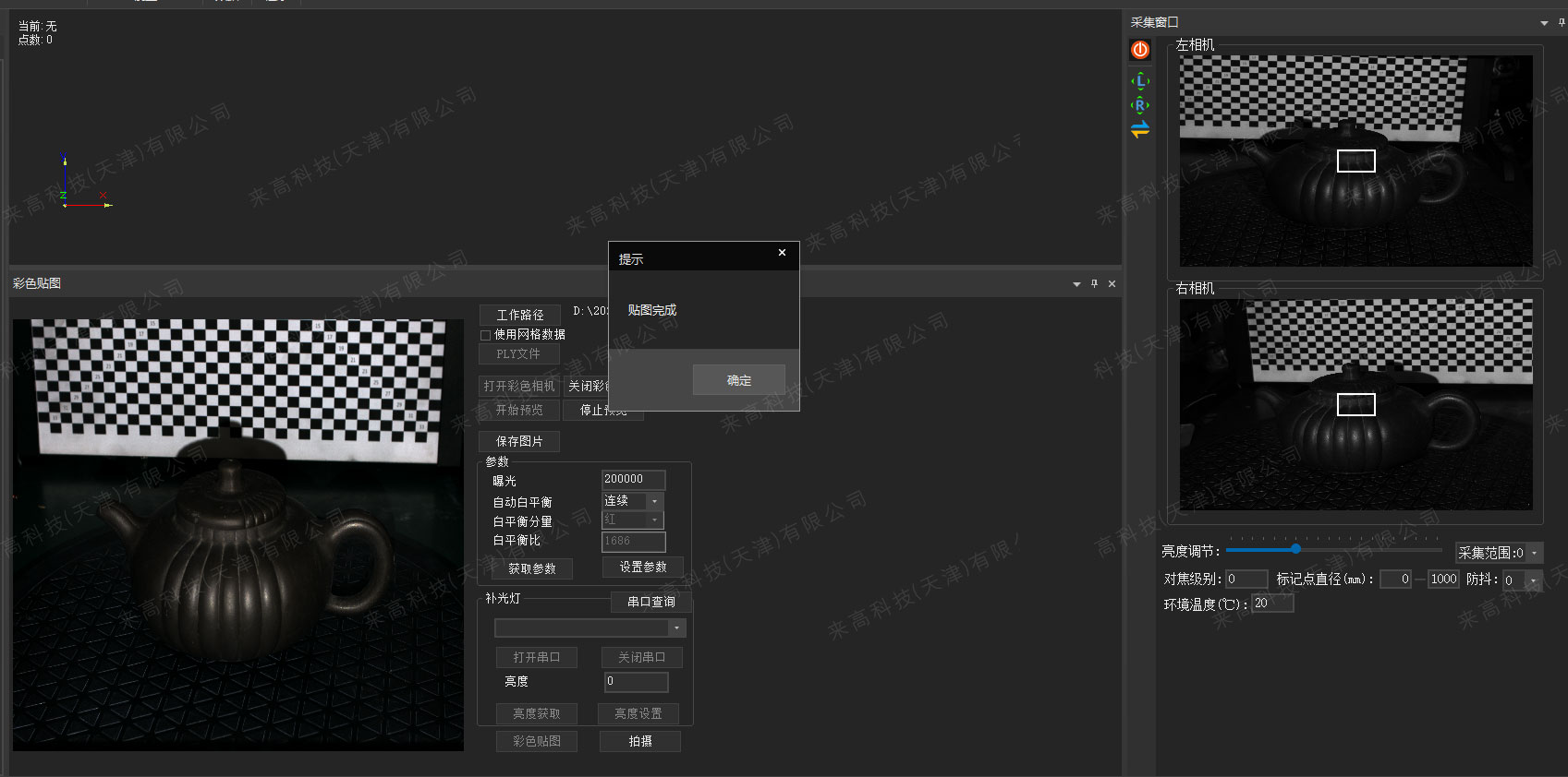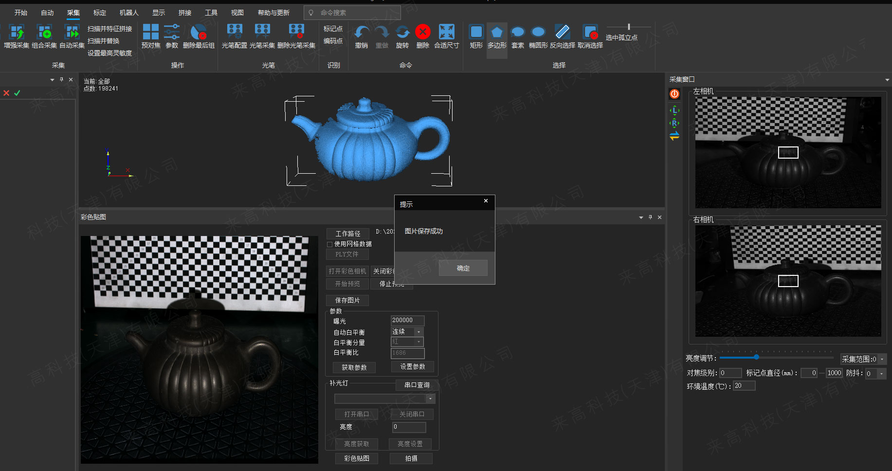 完成掃描后,用戶可以通過軟件界面中的“應用彩色貼圖”選項,觸發算法自動執行圖像與三維數據間的映射工作。系統會根據預先設定好的算法規則,將捕捉到的顏色信息圖片準確賦到三維模型表面,從而生成帶有逼真紋理的最終產物。貼圖完成后,用戶即可獲得整合了顏色信息的完整三維數據集,為后續的可視化或者分析提供了有效的依據。