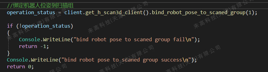 Console.WriteLine("bind robot pose to scaned group success\n");