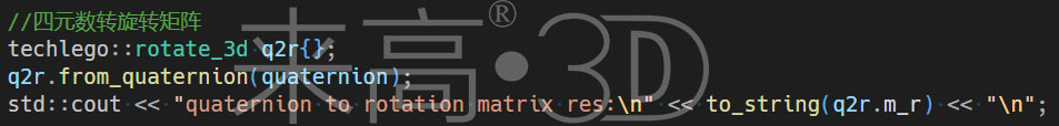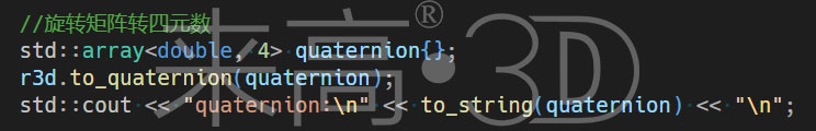 std::cout << "quaternion to rotation matrix res:\n" << to_string(q2r.m_r) << "\n";