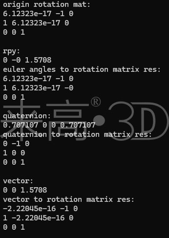 從上圖程序運(yùn)行結(jié)果可以看出各個(gè)旋轉(zhuǎn)描述方式間轉(zhuǎn)換的結(jié)果都正確無誤。注意其中帶e的負(fù)十幾次方的數(shù)值可以看為0。