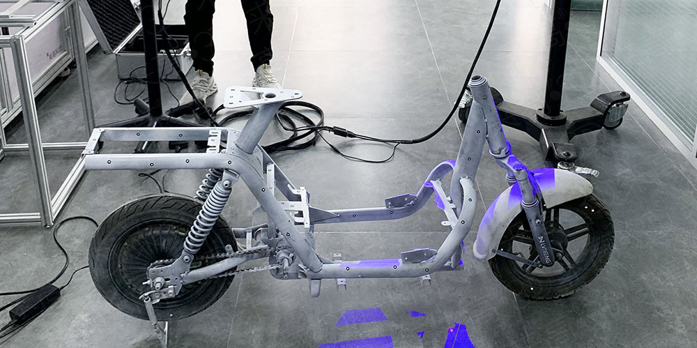 電動車車架噴涂顯像劑,這樣可以提高樣件表面底色的對比度,獲取更好的三維掃描數據。