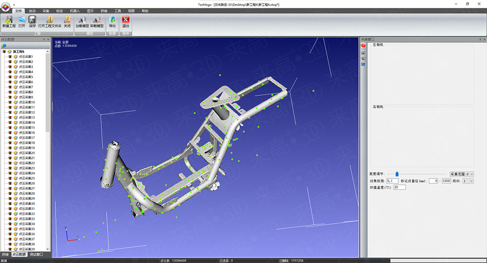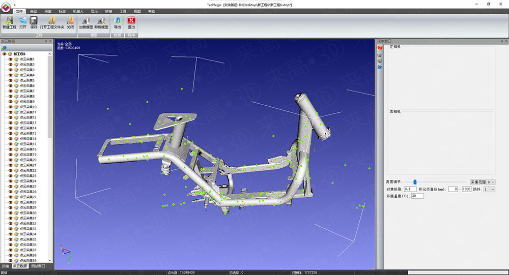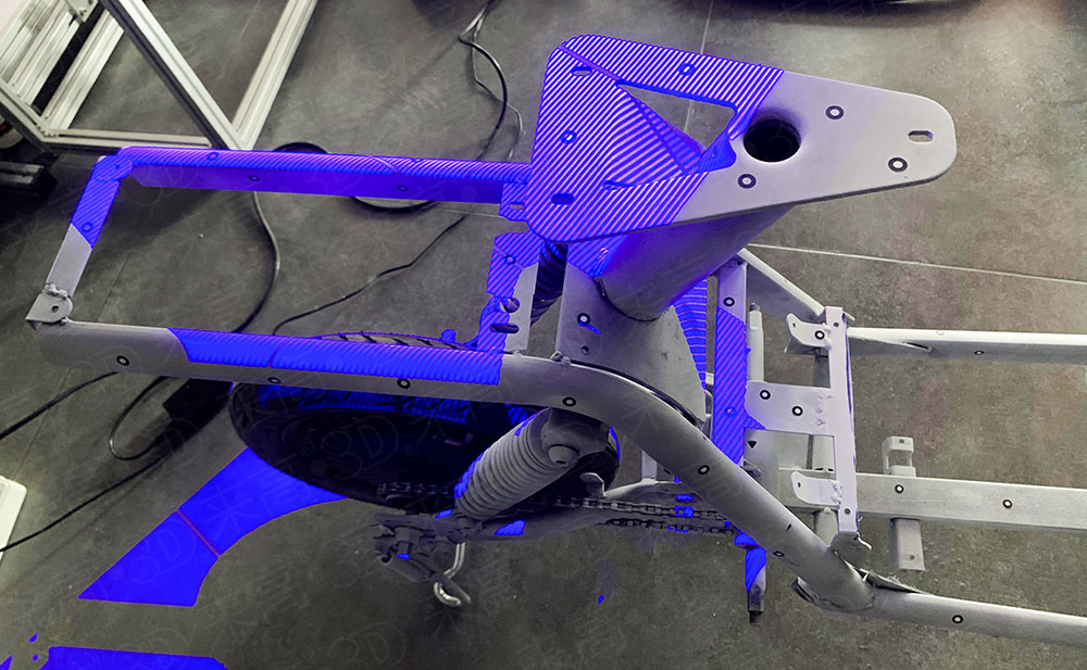 通過在電動車車架上粘貼標記點,獲取的數據在掃描軟件中進行定位拼接。