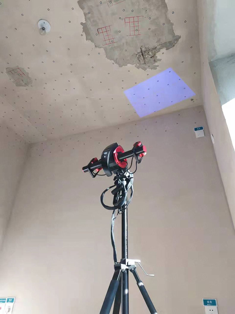 由于待測房屋屋頂尺寸較大,且層高偏高,來高科技采用手持式三維掃描儀Q7對屋頂進行三維掃描,手持式三維掃描儀的優點為高速度高精度掃描與軟件的高速拼接,通過手持模式與三腳架結合的模式對全屋頂進行整體三維掃描。