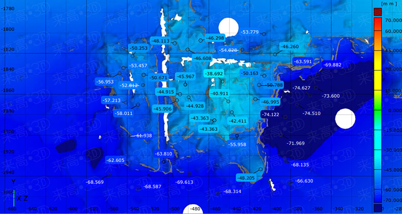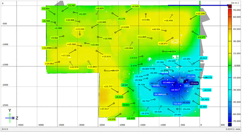 在掃描過程中,軟件自動對多幅掃描引起的累計誤差進行整體拼接修正,提高了工作效率,在1小時左右就完成了全部檢測工作。掃描工作完成后,通過專業檢測軟件對采集到的屋頂數據進行數據分析,包括墻皮的脫落程度房屋的塌陷程度等,獲得受損部位準確的數據報告。