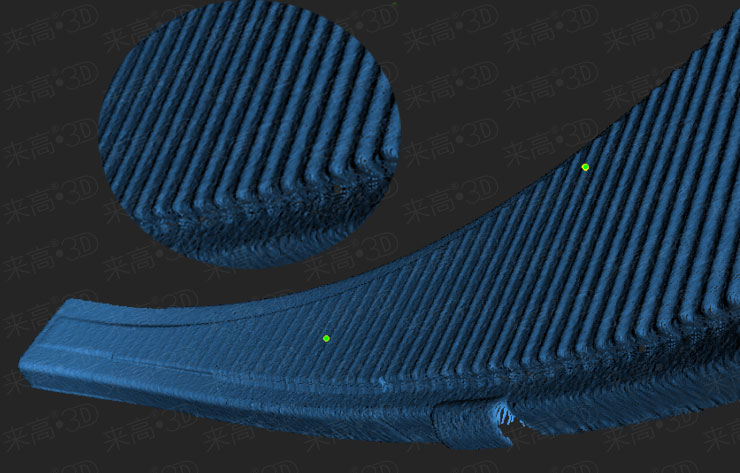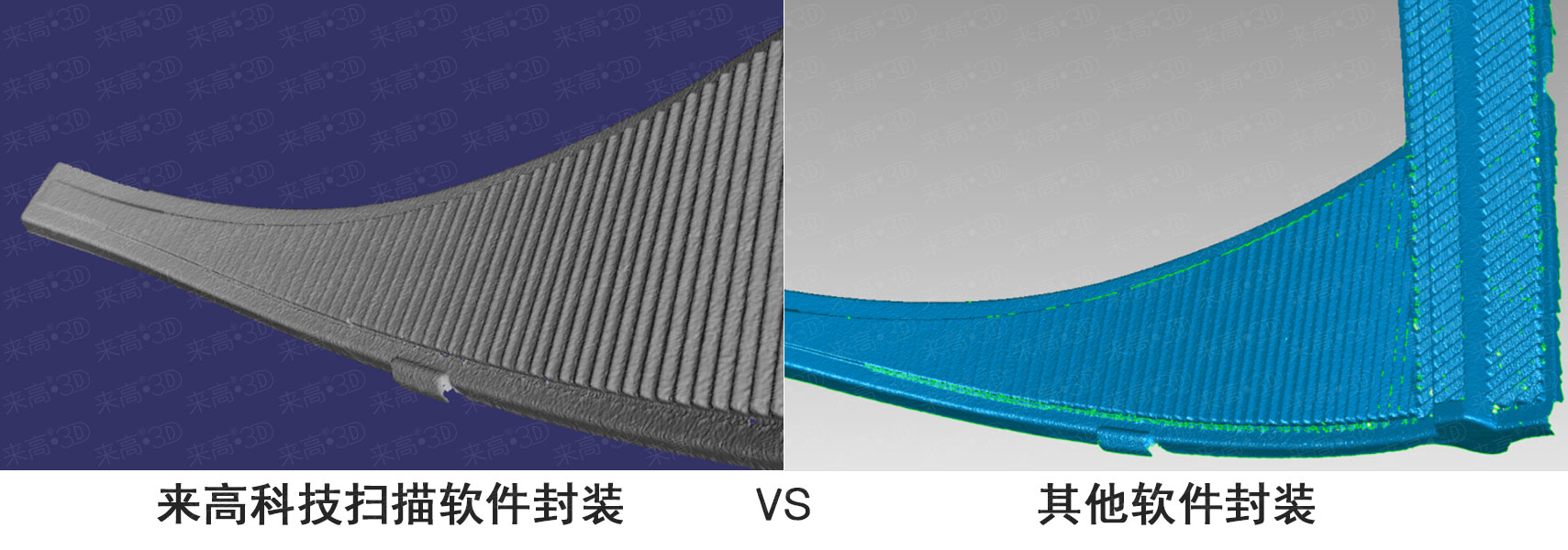 從以上三維數據圖片對比,我們可以看出,來高科技三維掃描軟件的封裝對于細節的把控與保留非常完整,并且沒有出現個別邊界封裝失敗的狀況。