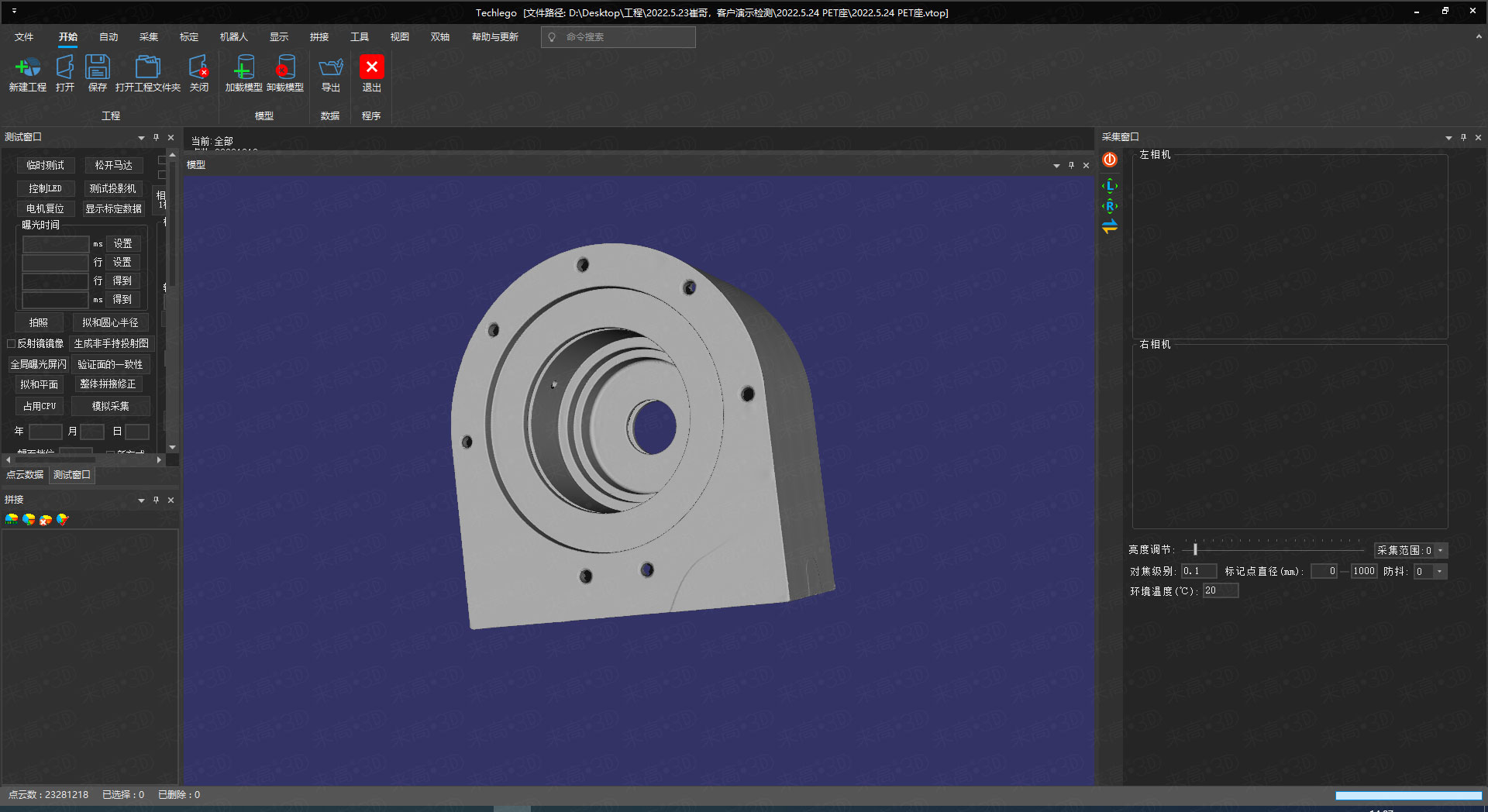 自動化三維掃描方案:通過3D智能相機與機械臂相配合,對PET底座進行自動化三維掃描,再通過專業(yè)三維檢測軟件對被測樣件進行全自動三維尺寸檢測。普通三維掃描方案:通過高精度三維掃描儀G5與三腳架相配合,對PET底座進行三維掃描,再通過專業(yè)三維檢測軟件對被測樣件進行三維尺寸檢測。