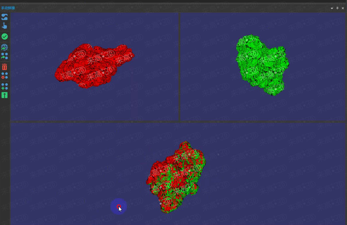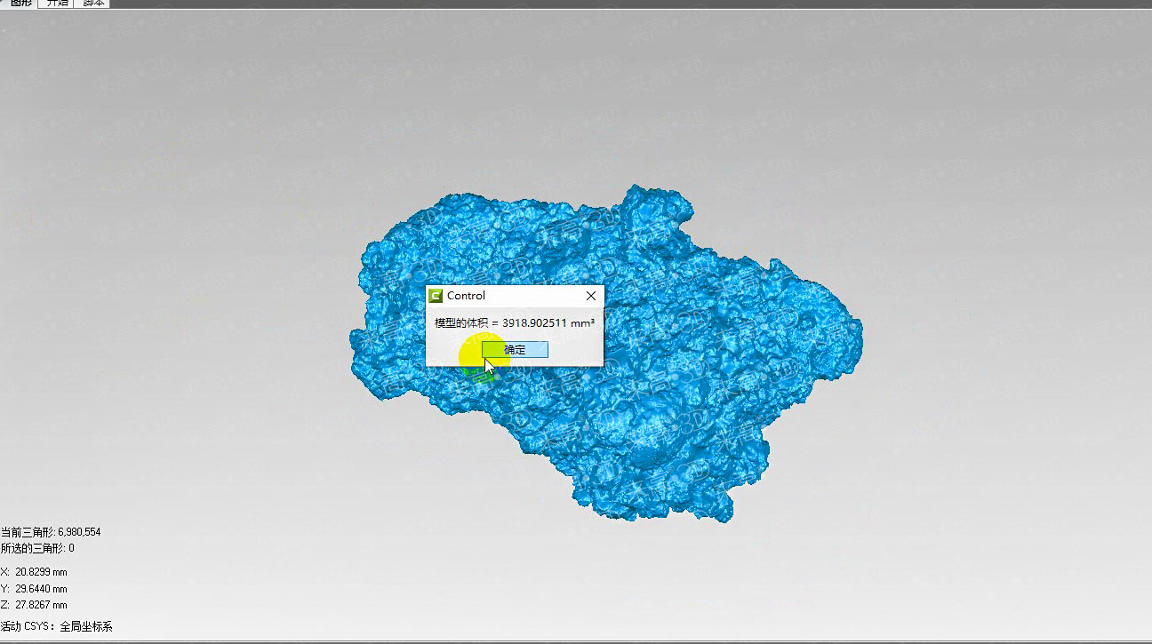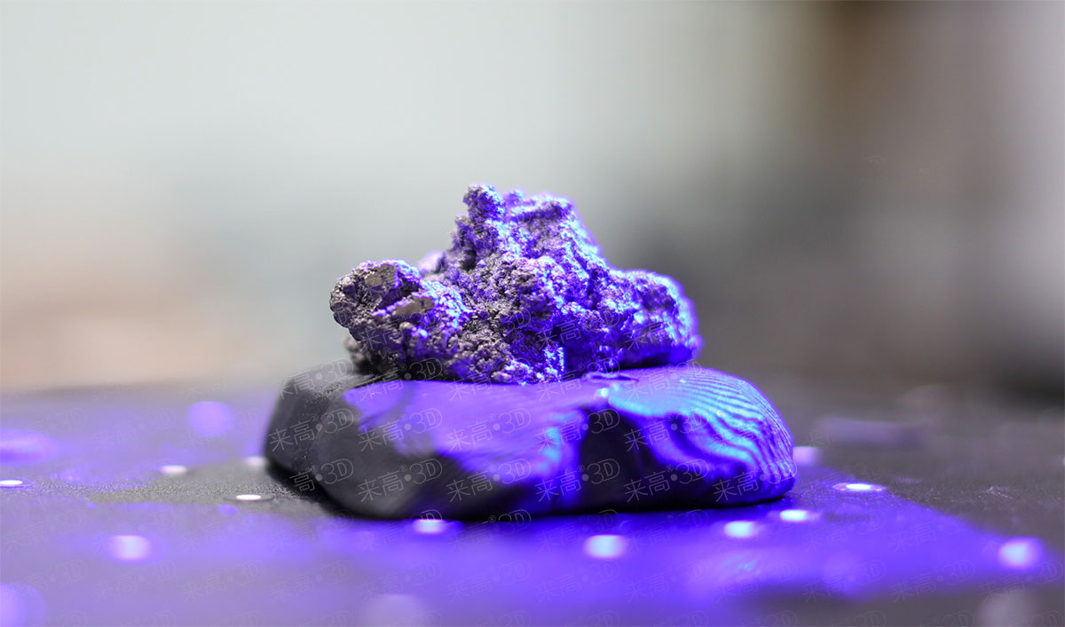 選用來高科技G5三維掃描儀(630萬像素),將掃描范圍調節為100x75mm²,已完成對工件的三維掃描。因其像素高、幅面小、點距微小,能夠真實反映鈦粉塊的形狀,所以為準確測量工件的體積提供了真實的三維數據。