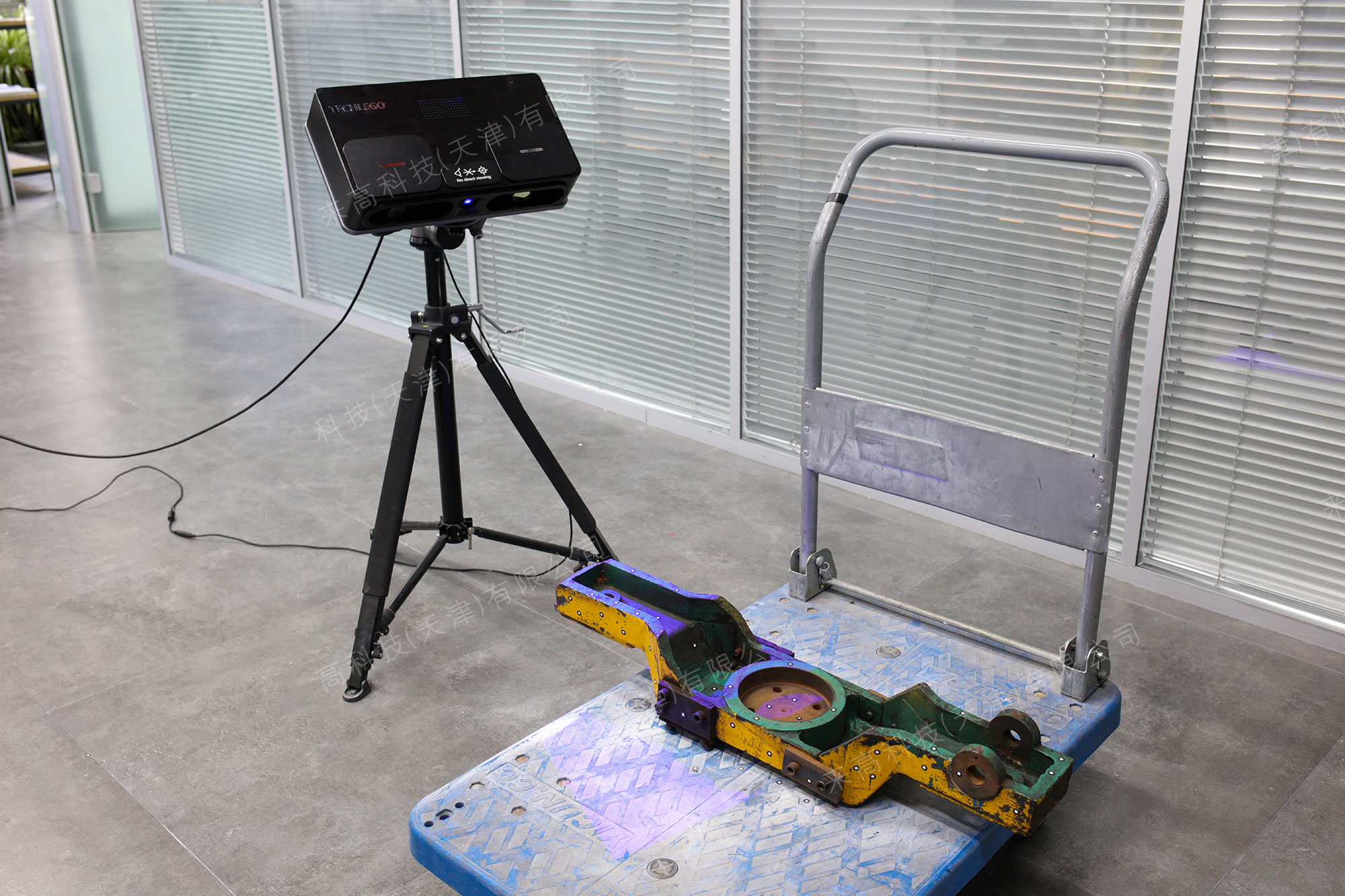由于鑄造爐零件體積較大,且重量較沉,掃描時,工件移動困難,所以將其放在小推車上,方便移動掃描。在零件上粘貼標記點用于拼接,以輔助掃描。