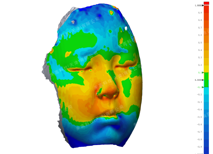 第二步:將這兩組數據導入專業的三維檢測軟件中對比分析,生成的色譜圖能直觀展示出面部結構在護理前后的變化情況。不僅有助于美容師了解護理的效果,也為顧客提供了可視化的改善結果。